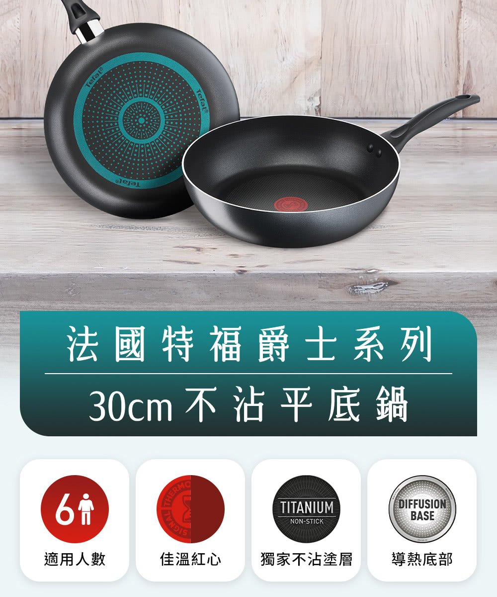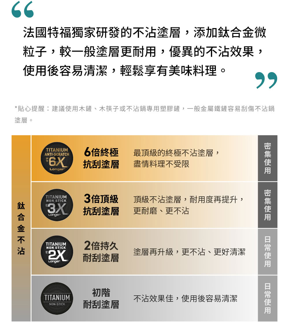 特福獨家研發的TITANIUM不沾塗層配方,添加鈦合金粒子,抗磨耐刮性最為優異,較一般不沾鍋更耐用,不沾效果佳又好清洗!