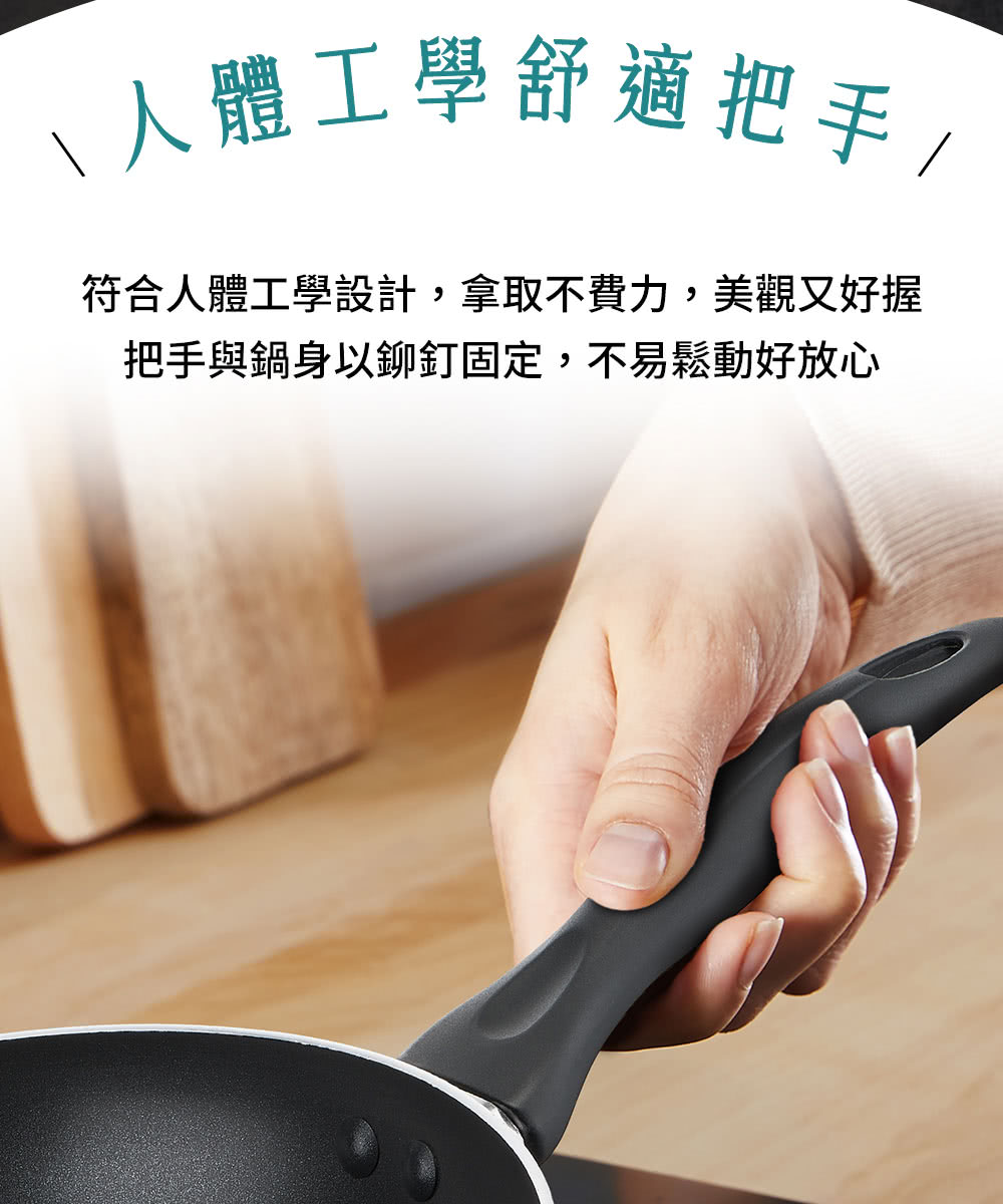 把手與鍋身以鉚釘固定,不易鬆動好放心,符合人體工學設計,拿取不費力、美觀又好握。