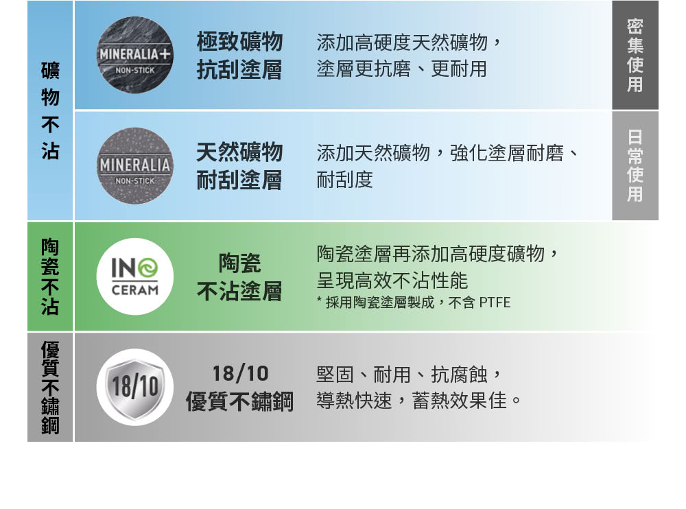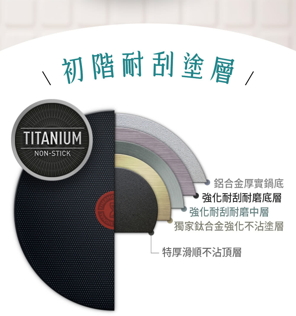 鈦合金TITANIUM是被運用於航太技術的高科技材料,具有耐磨、抗刮且不易變形的優點。同時也因為生物相容的特性,被應用於醫療材料、高級廚具;TITANIUM可更加強化鍋具的耐用壽命。