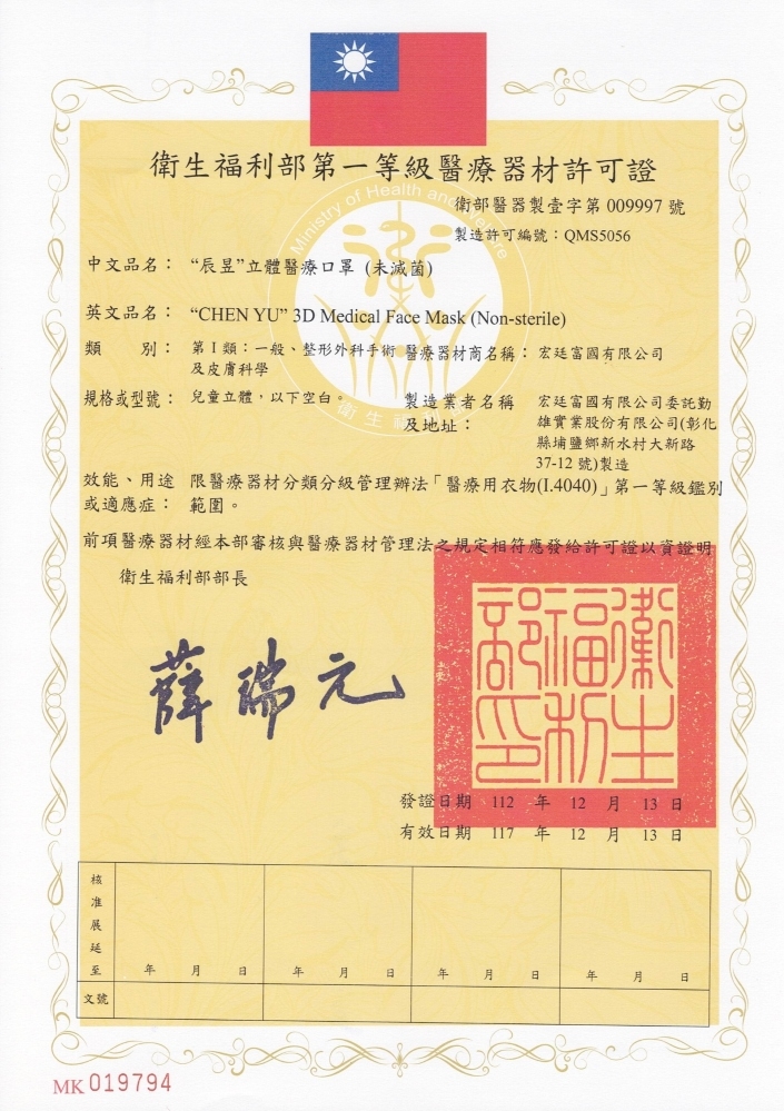 ◆核定品名:“辰昱”立體醫療口罩 (未滅菌)