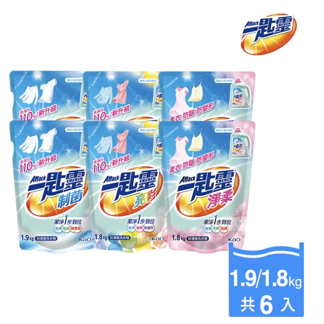 【一匙靈】ATTACK制菌/亮彩/淨柔超濃縮洗衣精補充包X6包(制菌1.9kgx6包/亮彩1.8kgx6包/淨柔1.8kgx6包)