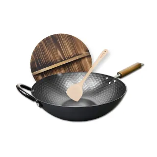 神田KANDA 日本製 窒化鐵 槌目紋 無塗層鐵炒鍋 鐵鍋 IH爐可用鍋 30cm(贈玻璃鍋蓋+木鏟)
